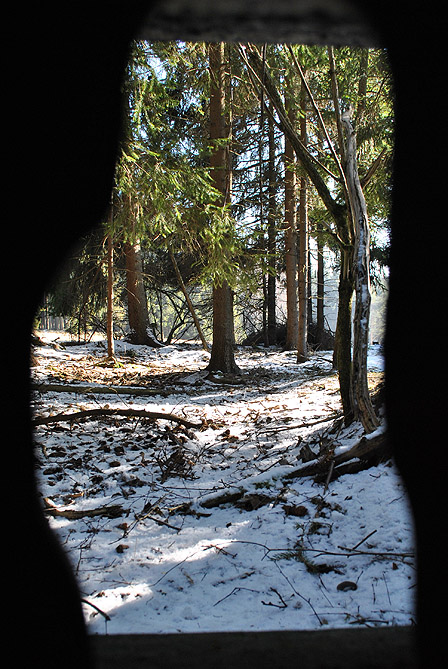 Landštejn vyhořel v roce 1771 pohled skrz hradební střílnu výhled na Landštejn