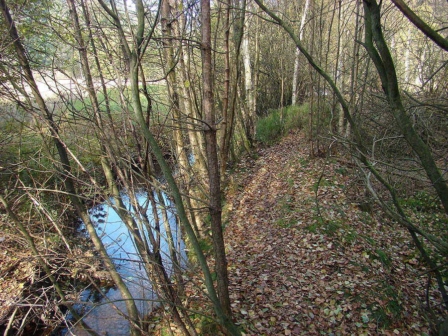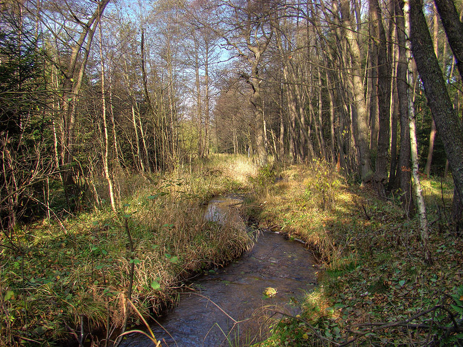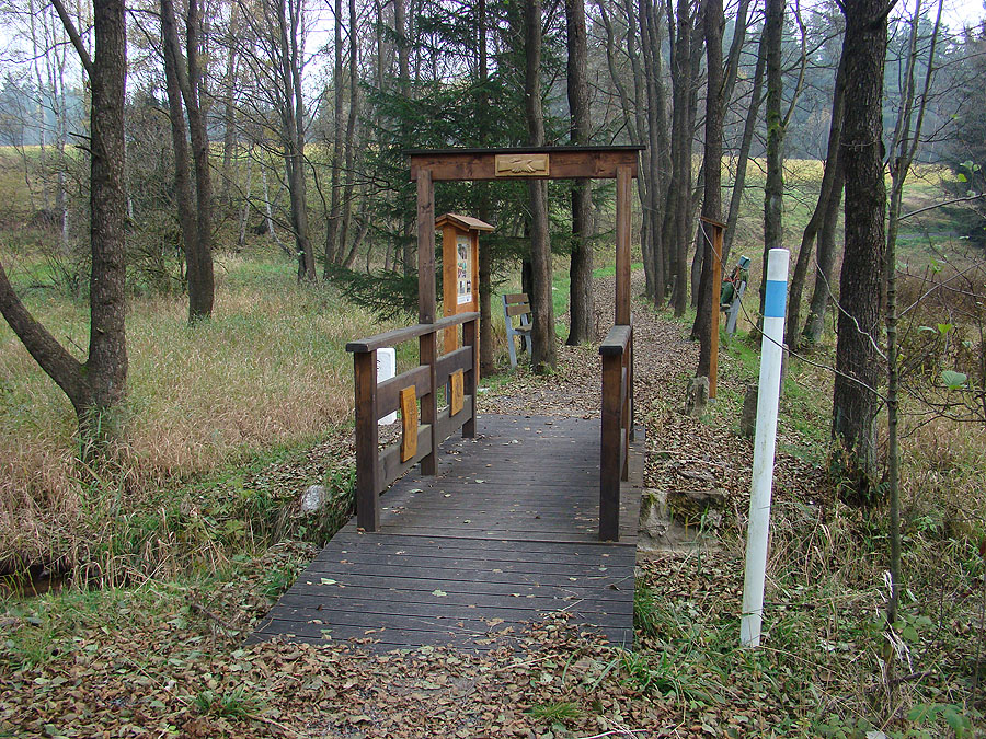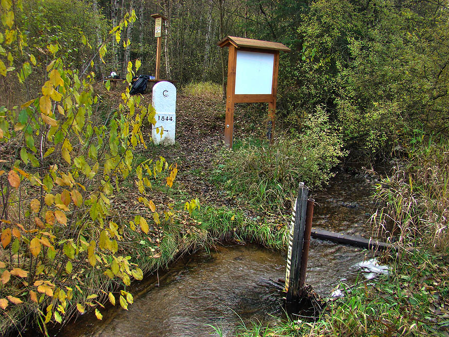 český hraniční kámen (v popředí) na břehu Újezdského potoka |