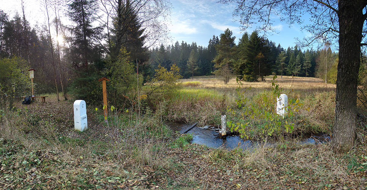 hraniční kameny (v popředí německý) na břehu Újezdského potoka |
