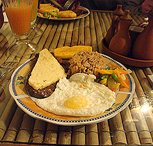 Na kraji vesnice směrem k ruinám se nachází příjemná restaurace v Grand hotelu. Zdejší trucho (ryba) s kombinací rýže a hranolek bylo naprosto vynikající! Malé pivo paceňa stálo 10Bs.