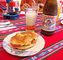 Nabídka jídel je podobná jako v Peru - kuřata, lamy, hovězí, morčata nebo pizzy a lazagně. Vynikající jsou ryby z jezera Titicaca - truchos!