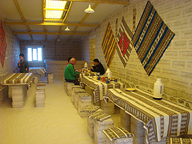 první noc na třídenním výletě po jižní Bolívii jsme strávili v solném hotelu u vesničky San Juan, jižně od Salar de Uyuni. Ubytování bylo v ceně výletu. Hotel je vybaven velmi skromně, jeho stěny, stoly i postele jsou vyrobeny ze solných kvádrů. Všechny pokoje jsou výhradně dvoulůžkové, záchody se sprchou jsou pro všechny společné a jsou v celém hotelu všeho všudy dva. K posezení a stravování slouží velká jídelna. Elektřina funguje až po zapnutí generátoru a např.nabíječku lze používat pouze za mírný poplatek. Přesto (nebo právě proto) tu lze strávit příjemnou noc mimo civilizaci a její výdobytky. Ideální místo pro pozorování noční oblohy!