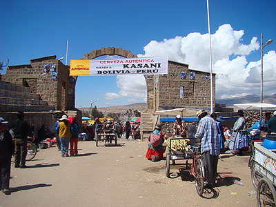 9.9.2008 - Ráno v 7:40 jsme opustili Puno a za 25 Solů jsme vyrazili do Bolívie. Přesně v 9:51 jsme překročili hranici, kterou tady na poloostrově vybíhajícím do jezera Titicaca představuje tato nepřehlédnutelná brána.
