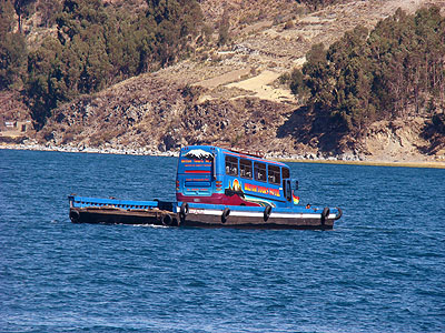 V 13:40 vyrážíme z Copacabany do La Pazu. V cestě nám stojí úžina mezi městečky Tiquina a San Pablo, kterou náš autobus musí zdolat pomocí tohoto primitivního prámu. My se tu definitivně loučíme s jezerem Titicaca.