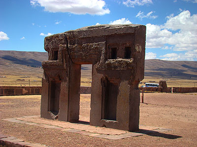 Nejznámějším fragmentem na obřadní plošině Kalasasaya je tato Sluneční brána (Puerta del Sol), která je symbolem Tiahuanaca. Společně s oběma monolity tvoří symetrický trojuhelník. Význam této geometrie zůstává stále nerozluštěn.