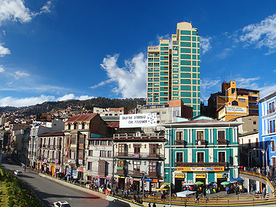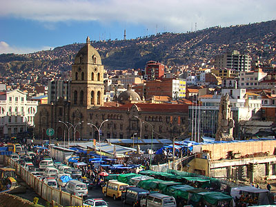 Ještě že přes náměstí San Francisco vede nadchod, ze kterého je vyfocena i tato fotografie. Přebíhání rušné třídy Mariscal Santa Cruz by bylo v dopravní špičce asi o život.