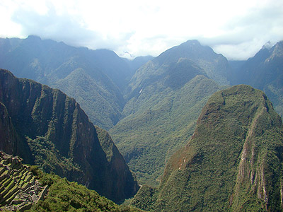 ...obklopené strmými andskými vrcholky okolních hor. O 500 výškových metrů níže skalní ostroh s kamenným městem obepíná strmé údolí řeky Urubamby. Úžasná scenérie!
