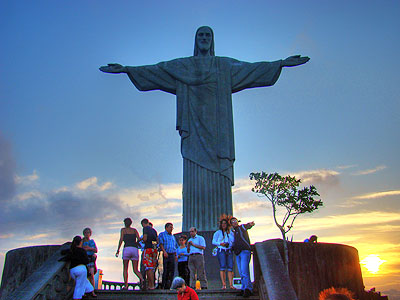 A jsme nahoře u sochy Krista Vykupitele. Máme štěstí na úžasné počasí, ale mraky přicházející od západu nevěstí nic dobrého. I náš brazilský průvodce předpovídá na zítřek déšť...