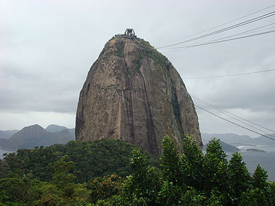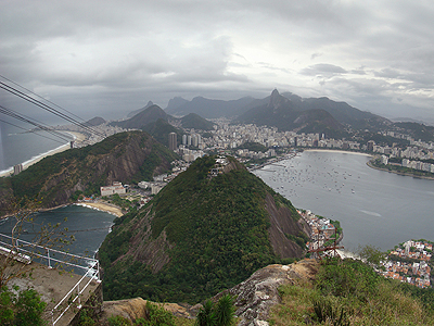 Oblačnost nakonec nevadí a klasický výhled na Rio nemá chybu. Zleva Copacabana, malá pláž Vermelha, sousední kopec Morro de Urca a vedle něj vpravo záliv Botafogo. Nad tím vším samozřejmě bdí Kristus ze svého místa na Corcovadu (nejvyšší pahorek uprostřed).