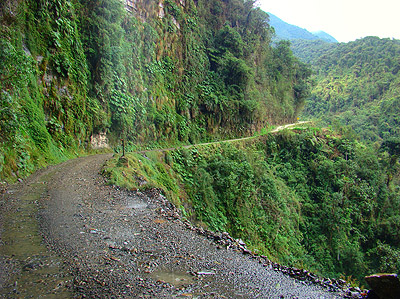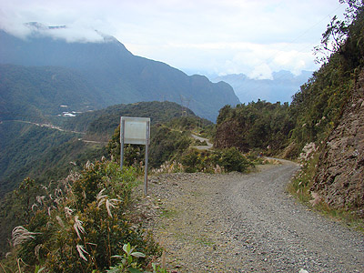 Sráz pod silnící je vskutku vysoký. Pády aut dolů do propasti nebyly ničím výjmečným, proto se cestě trefně říká "Camino dela muerte - Silnice smrti". Pomníčky na okraji srázu (viz.křížek u cesty v levé části snímku) by mohly vyprávět...