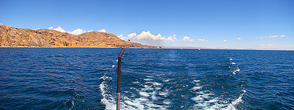 | plavba po jezeře Titicaca, vlevo výběžek poloostrova Tacasayonipampa