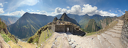 213° panorama složené z 26 fotografií zachycuje Machu Picchu z jižní strany. Vlevo pod terasami je dobře patrné údolí Urubamby, vpravo za terasami stojí chatrč hlídače Pohřebního kamene.